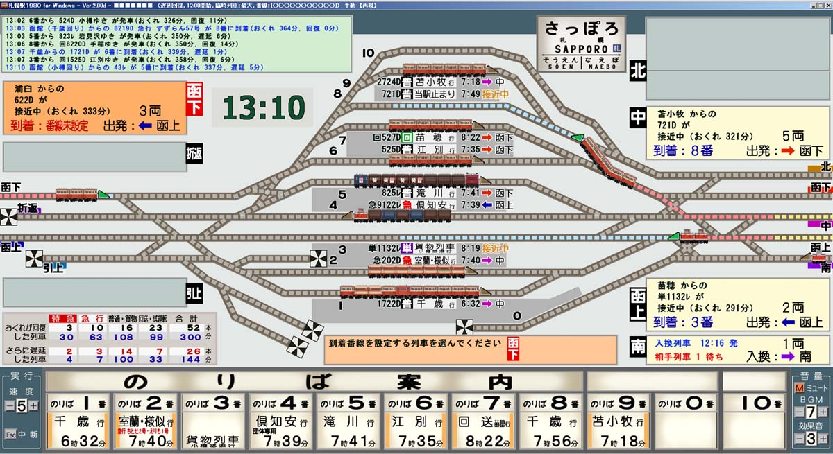 当時の札幌駅には、0〜9番線までの10本のホームと、北側にホームのない線が1本がありました。(実際には機回線+2線と、さらに北側に札幌客貨車区の線路がありましたが、今回はこれは省略します。) また、桑園方の本線間と南側にそれぞれ引上線があって、南側の引上線からは荷物ホームにつながっていました。 列車は、桑園方の1線(ゲーム中では「函下」と表記)、苗穂方の3線(南(下)側から「函上」「中」「北」と表記)から到着します。 苗穂方には南側にさらに1線(「南」と表記)がありますが、この線は引上線としてのみ使われます。 列車は、桑園方の1線(ゲーム中では「函上」と表記)、苗穂方の3線(南(下)側から「中」「函下」「北」と表記)に向けて出発します。 札幌駅で折り返しをする列車は多く、同時出発、同時到着も多いため、必然的に進路は交錯します。列車に遅延を発生させないことは、かなり大変です。 配線を見ればわかると思いますが、0〜2番線から苗穂方の「函下」「北」には出発できません。したがって、その方向に出発する列車を、0〜2番線に入線させることはできません。 苗穂方の「中」と「北」は、到着と出発の共用線路です。それらの線路から列車が接近しているときは、その線路へ列車を出発させることはできません。このとき、接近中の列車を入線させるホームがないと、デッドロック状態になり、ゲームを進めることができなくなります。 各ホームには入線可能な編成長があって、長編成の列車が入線できないホームがあります。また、荷物・郵便車を連結した列車(回送を除く)は、荷物用エレベータと跨線橋で結ばれている1〜5番線のみに入線できます。 今回のゲーム固有の制約として、特急列車は8〜9番線には入線できません。また臨時を除く急行列車は8〜9番線からは発車できません。(これは入線可能な編成長の制約のほか、売店などの制約によります。) また、現実では本線と10番線以北は信号の関係で直接出入することができませんでしたが、本ゲームでは直接着発できるようにしています。 今回のリニューアル版では、前作で実現できなかった折返し客車列車の機回しと、荷物・郵便車の増解結と、列車の分割併合をすべて再現しました。(一部の入換列車は、誤操作によるゲームの進行不能を避けるために、自動で走行します。)