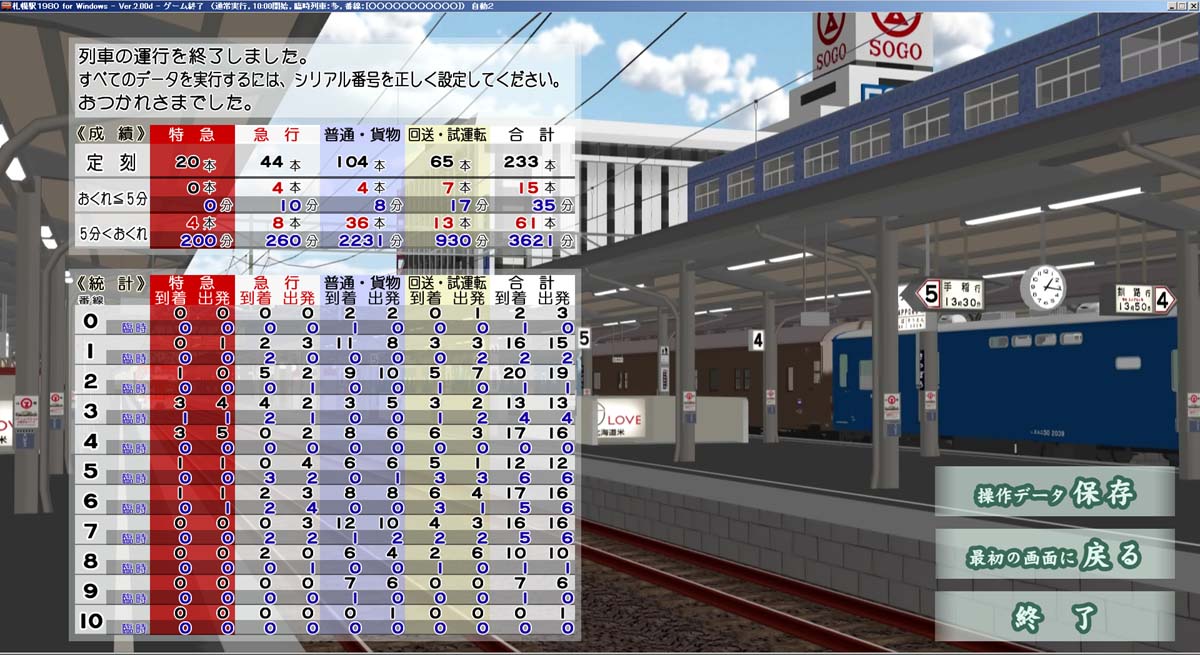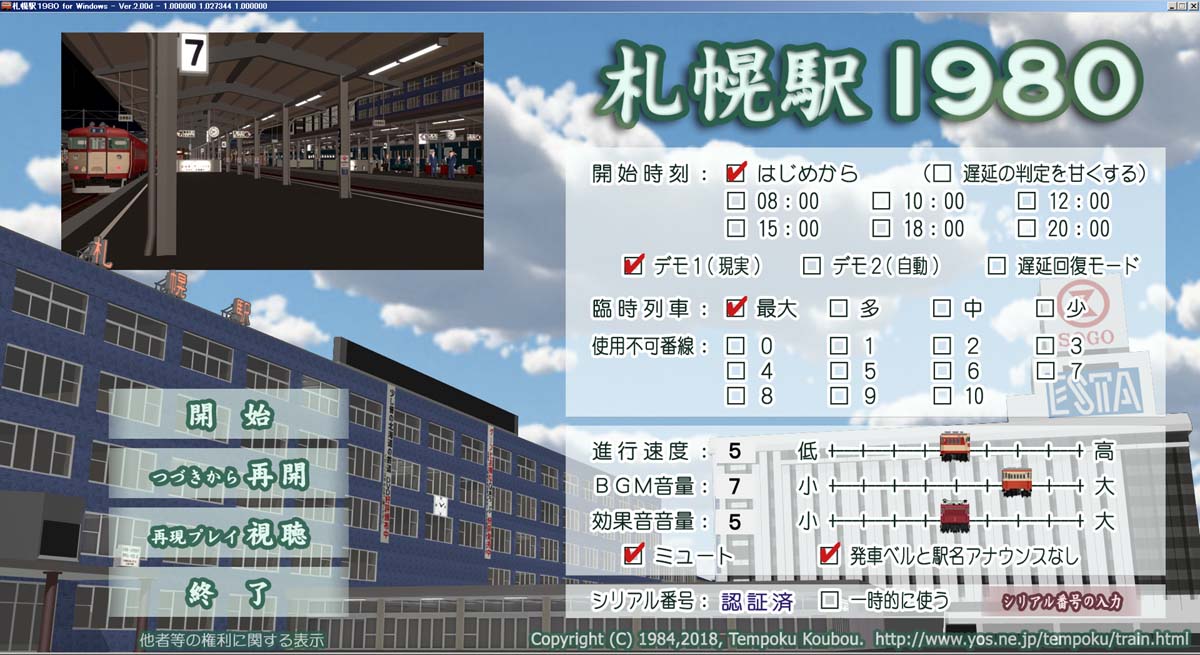 2021/04/22 ![]() このページのコピーサイト、キャッシュサイト等にご注意ください。 オリジナルのURL以外からのファイルのダウンロード等は大変に危険です。 ブラウザのURLの表示が「https://www.yos.ne.jp/tempoku/」で始まっていることを必ずご確認ください。 2020/05/02 ※ 当Webページでの通頒(コミケで頒布したものと同じパッケージ)はこちらからどうぞ。 ※ 書泉グランデ(東京神田神保町)鉄道フロアにて委託で頒布中です。 ※ ベクターからのダウンロード頒布はこちらからどうぞ。 (まずダウンロードして、ご利用のPC環境で動作することを確認してからご購入ください。) ※ BOOTHでの通頒はこちらからどうぞ。(2022/08/27) ![]() 2019/06/18 ※『札幌駅1980』Ver.2の不具合修正版Ver.2.00hをリリースしました。 Ver.2.00d〜2.00fをご利用の方は、以下の修正版をご利用ください。 【修正内容】 (Ver.2.00d → 2.00e) ・ 通常モードで「はじめから」起動時に、前回実行時に指定した開始時刻から開始してしまう不具合を修正。 (Ver.2.00e → 2.00f) ・ 遅延回復モードで最終列車を定時刻で発車させた時点で構内に他の遅延列車がいる場合に、遅延回復達成に ならない不具合を修正。(最終列車を定時刻で発車させた時点で構内に他の遅延列車がいた場合には、最終 列車が構内から出た時点で遅延回復達成になります。) (Ver.2.00f → 2.00h) ・ 「札幌駅1980」を起動した直後以外(プログラムを終了しないで2回目以降のプレイ)に、ゲーム内の時刻で 8:00以前にセーブしたデータを再開すると、途中から列車が現れなくなる不具合を修正。 ・ ゲームの実行速度を遅くした場合に、キーボードとマウスの反応が鈍くなることがある現象を改善。 ダウンロードしたファイルを解凍の上、Readme.txtファイルをお読みください。 (このファイルを利用するためには『札幌駅1980』Ver.2.00d〜2.00fのいずれかが別途必要です。) | |